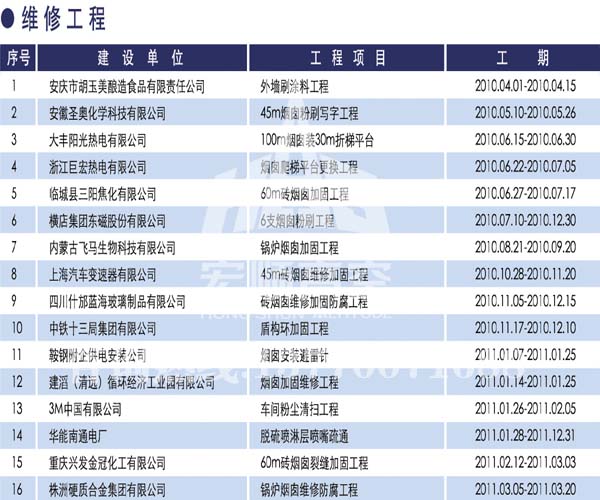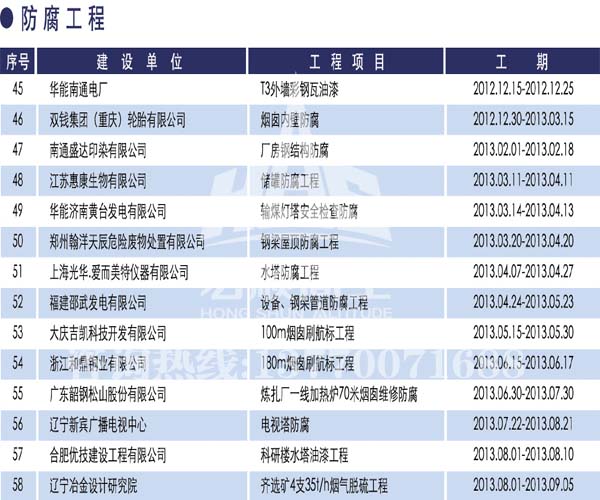 宏順建設工程有限公司是國家批準成立的專業(yè)高空作業(yè)企業(yè):承攬過(國內(nèi).國外)煙囪新建、煙囪防腐、吊機防腐、水塔防腐、管道防腐、龍門吊防腐、儲存罐防腐、煙囪內(nèi)壁防腐等高空作業(yè)工程。具有“不搭腳手架 、 不需要停產(chǎn)”施工特點。